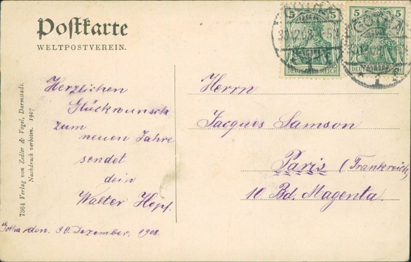 Alte Ansichtskarte aus Gotha, gelaufen am 30.12.1908 von Gotha nach Paris.