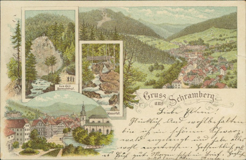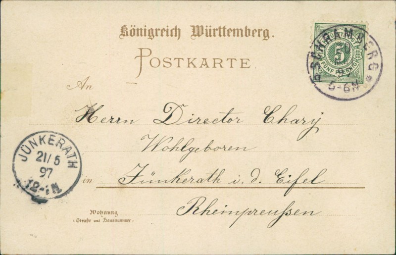 Alte Ansichtskarte aus Schramberg, gelaufen am 20.05.1897 von Schramberg nach Jünkerath. Ankunft in Jünkerath am 21.05.1897.