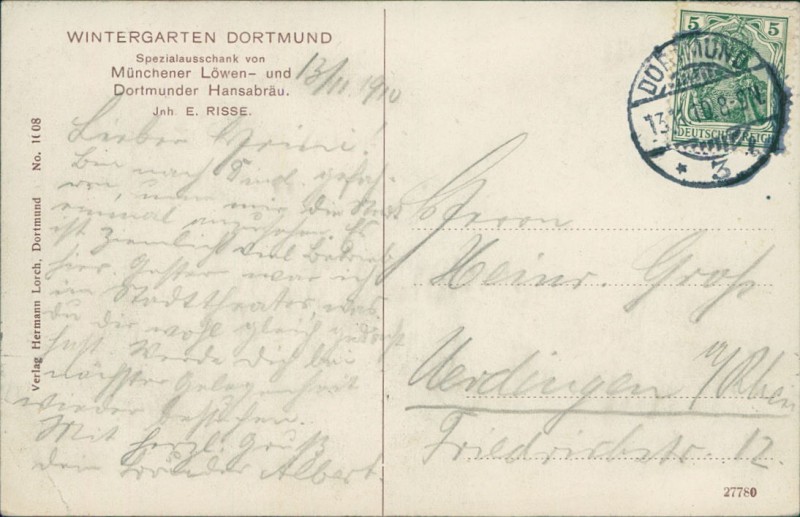 Alte Ansichtskarte aus Dortmund, gelaufen am 13.11.1910 von Dortmund nach Uerdingen.