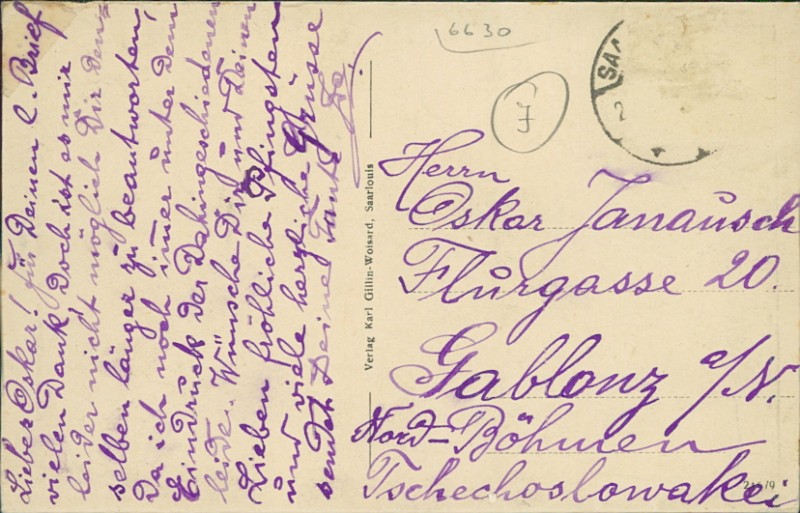 Alte Ansichtskarte aus Saarlouis, gelaufen um 1920 von Saarlouis nach Gablonz a/N.