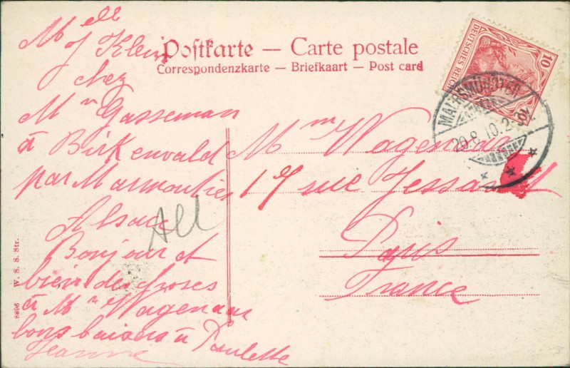 Alte Ansichtskarte aus Maursmünster / Marmoutier, gelaufen am 20.08.1910 von Maursmünster nach Paris.