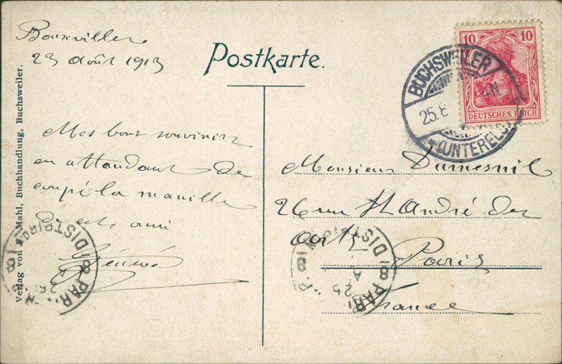 Alte Ansichtskarte aus Buchsweiler / Bouxwiller, gelaufen am 25.08.1913 von Buchsweiler nach Paris.