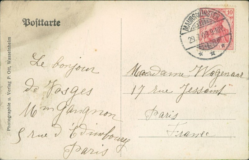 Alte Ansichtskarte aus Birkenwald, gelaufen am 29.07.1919 von Maursmünster nach Paris.