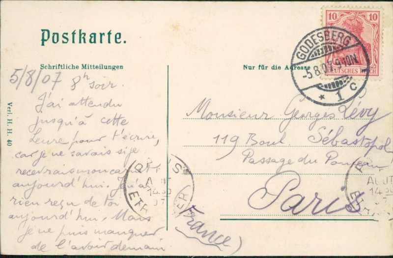 Alte Ansichtskarte aus Bonn-Bad Godesberg, gelaufen am 05.08.1907 von Godesberg nach Paris.