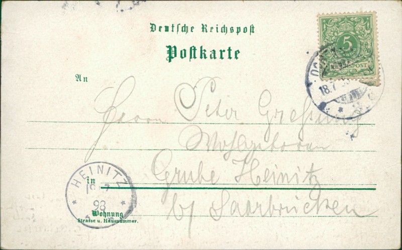Alte Ansichtskarte aus Dortmund, gelaufen am 18.07.1898 von Dortmund nach Heinitz. Ankunft in Heinitz am 19.07.1898.