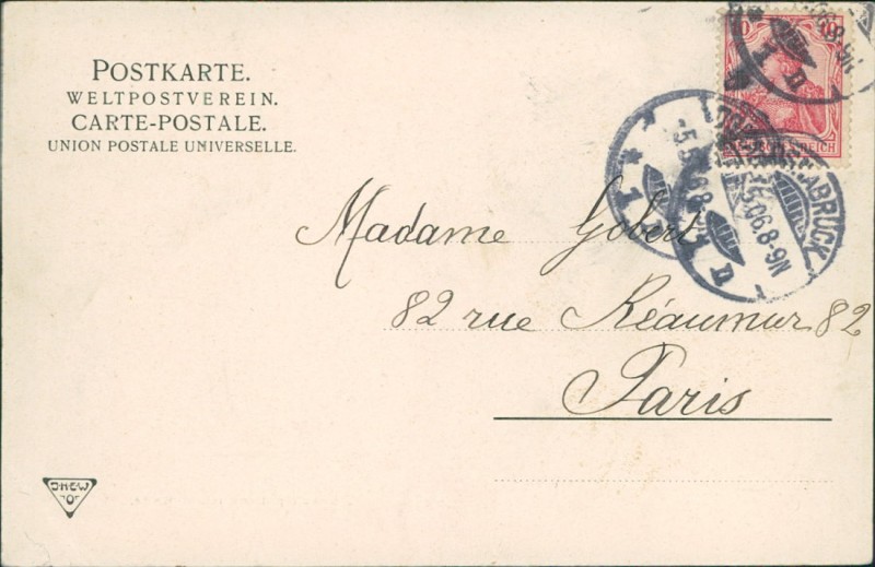 Alte Ansichtskarte aus Osnabrück, gelaufen am 05.05.1906 von Osnabrück nach Paris.