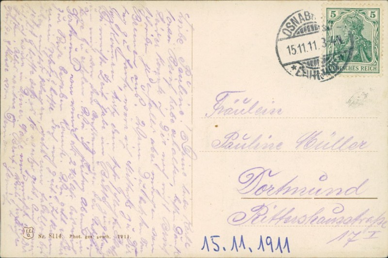 Alte Ansichtskarte aus Osnabrück, gelaufen am 15.11.1911 von Osnabrück nach Dortmund.