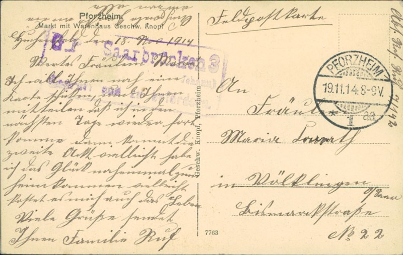 Alte Ansichtskarte aus Pforzheim, gelaufen am 19.11.1914 von Pforzheim nach Völklingen.