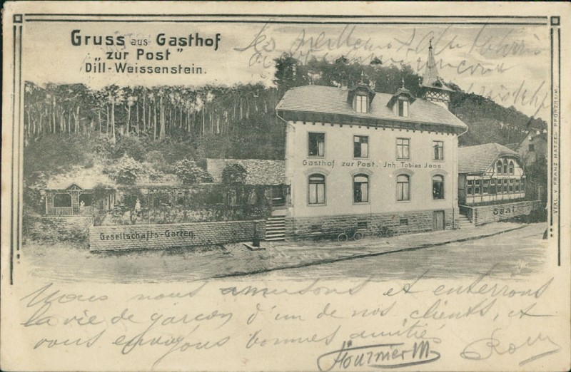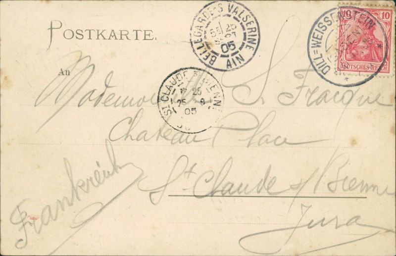 Alte Ansichtskarte aus Pforzheim, gelaufen am 24.09.1905 von Dill-Weissenstein nach St. Claude. Ankunft in St. Claude am 25.09.1905.