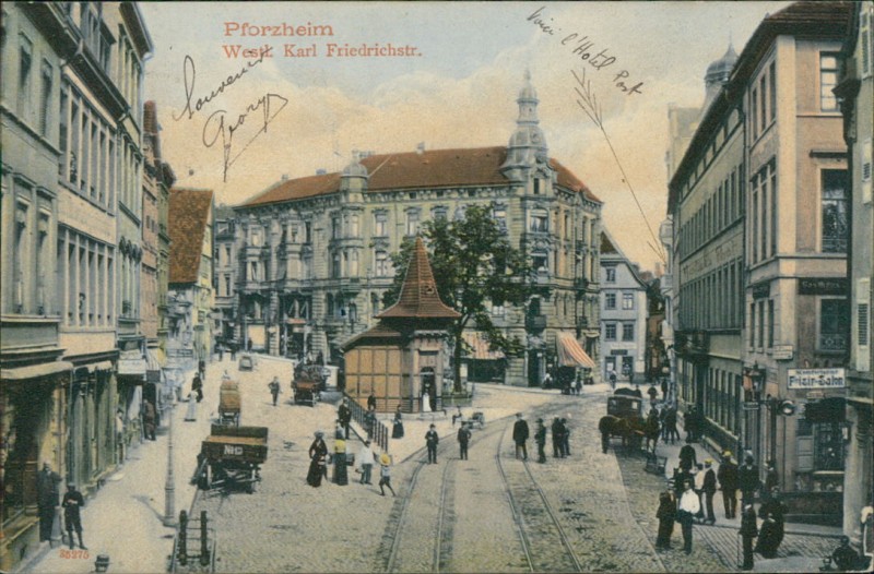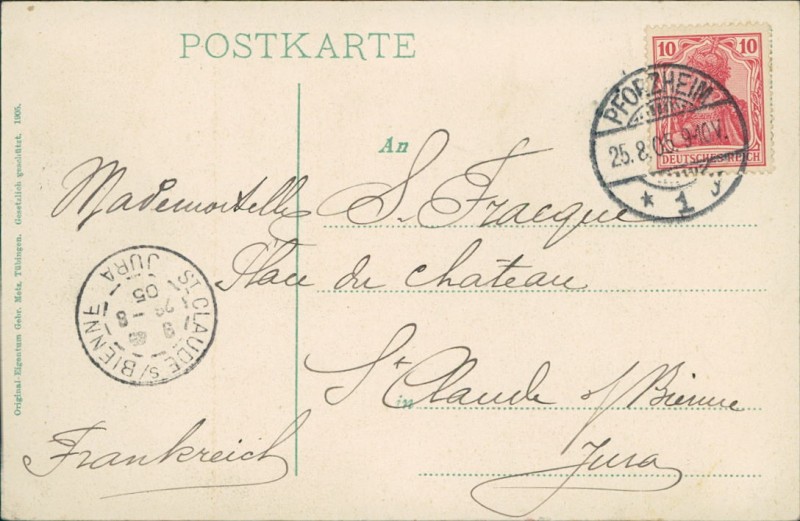 Alte Ansichtskarte aus Pforzheim, gelaufen am 25.08.1905 von Pforzheim nach St. Claude. Ankunft in St. Claude am 26.08.1905.