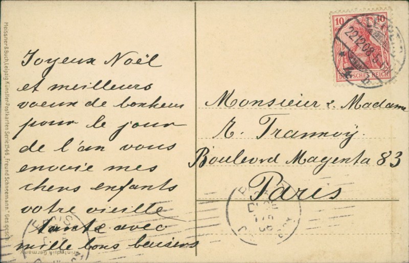 Alte Ansichtskarte, gelaufen am 22.12.1908 von Leipzig nach Paris.
