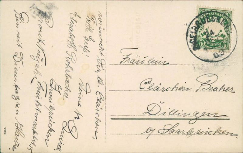 Alte Ansichtskarte, gelaufen am 24.12.1909 von Zweibrücken nach Dillingen bei Saarbrücken.