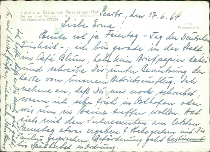 Alte Ansichtskarte aus Nonnweiler-Braunshausen, beschrieben am 17.06.1964.