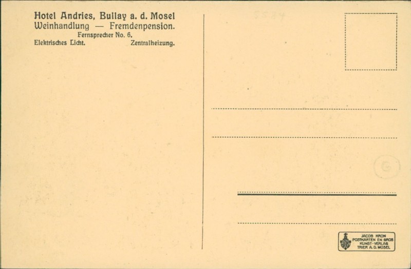 | Verlag | Jacob Kron Postkarten en gros Kunst-Verlag Trier a. d. Mosel |