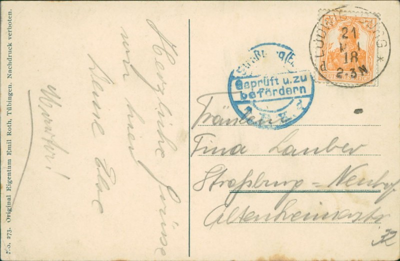 Alte Ansichtskarte aus Ludwigsburg, gelaufen am 21.05.1918 von Ludwigsburg nach Straßburg-Neudorf.