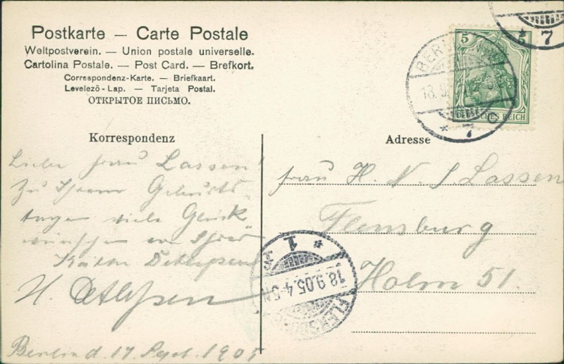 Alte Ansichtskarte aus Berlin, gelaufen am 18.09.1905 von Berlin nach Flensburg. Ankunft in Flensburg am 18.09.1905.