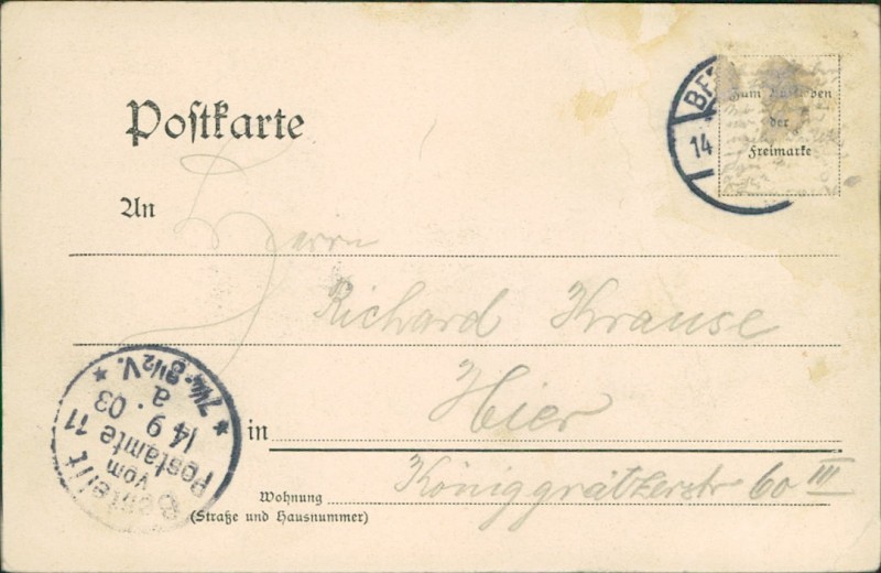 Alte Ansichtskarte aus Berlin, gelaufen am 14.09.1903 von Berlin nach Berlin. Ankunft in Berlin am 14.09.1903.