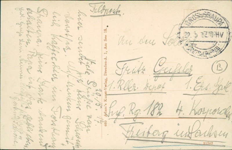 Alte Ansichtskarte aus Graupa, gelaufen am 20.05.1917 von Grossgraupa nach Freiberg in Sachsen.