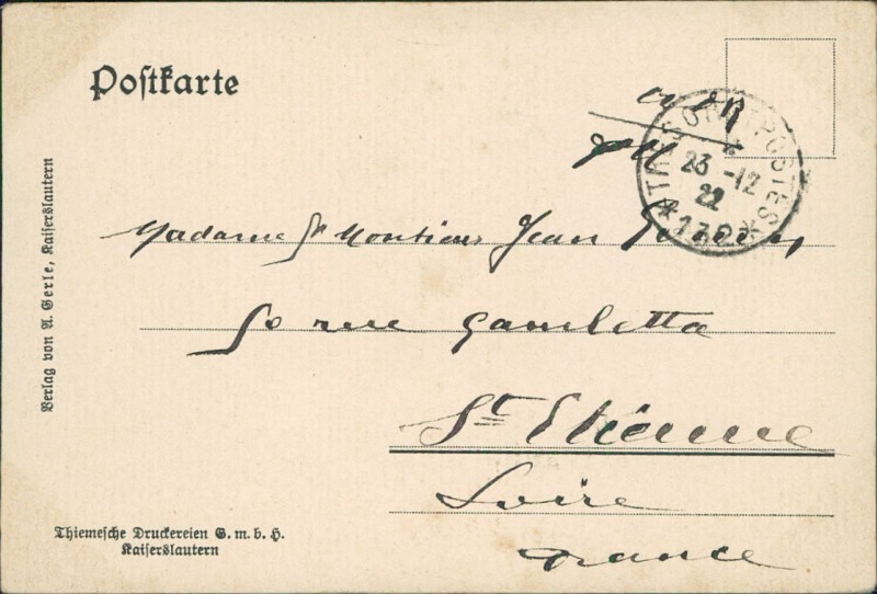 Alte Ansichtskarte aus Kaiserslautern, gelaufen am 23.12.1922.