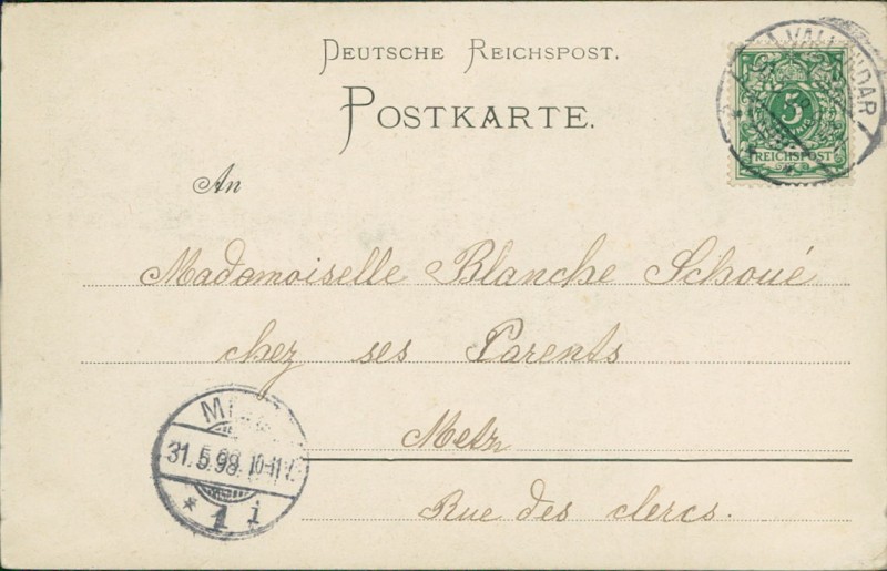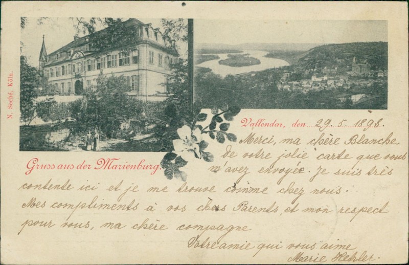 Alte Ansichtskarte aus Vallendar, gelaufen am 30.05.1898 von Vallendar nach Metz. Ankunft in Metz am 31.05.1898.