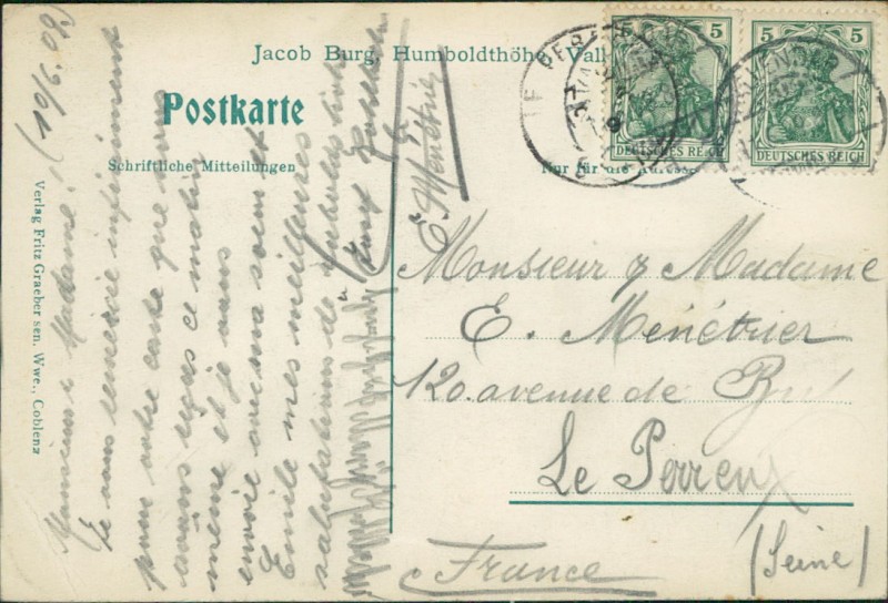 Alte Ansichtskarte aus Vallendar, gelaufen am 10.06.1909 von Vallendar nach Le Perreux.