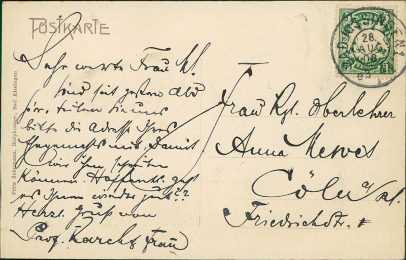 Alte Ansichtskarte aus Bad Kissingen, gelaufen am 28.08.1908 von Bad Kissingen nach Cöln a/Rh.
