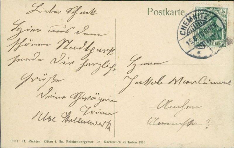 Alte Ansichtskarte aus Chemnitz, gelaufen am 15.06.1910.