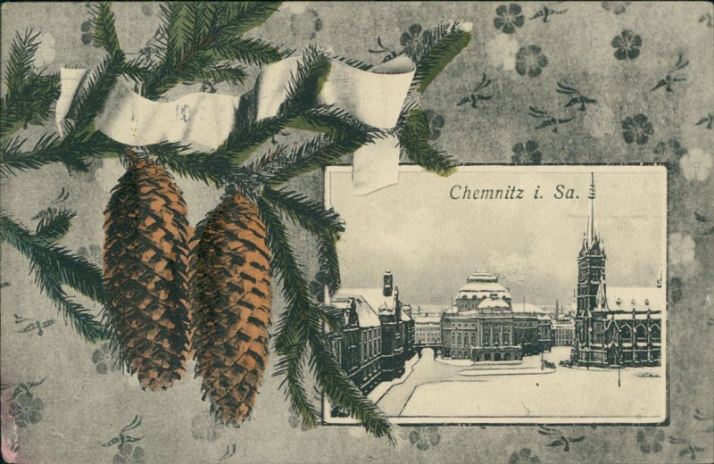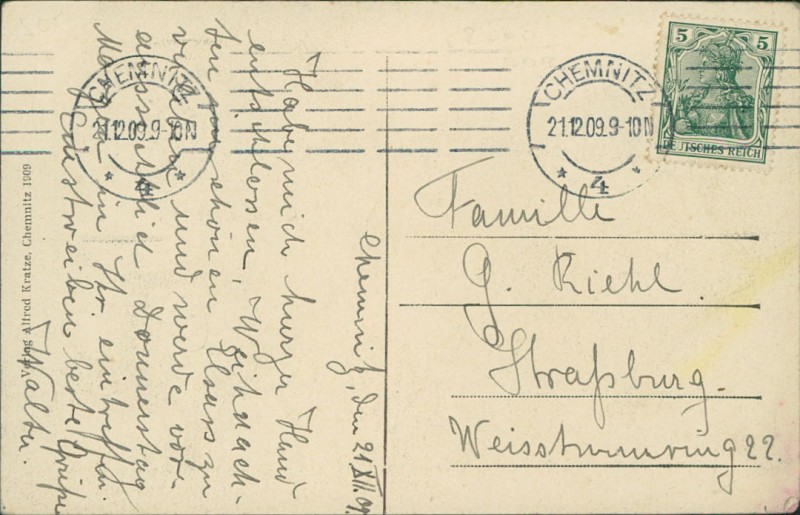 Alte Ansichtskarte aus Chemnitz, gelaufen am 21.12.1909 von Chemnitz nach Straßburg.