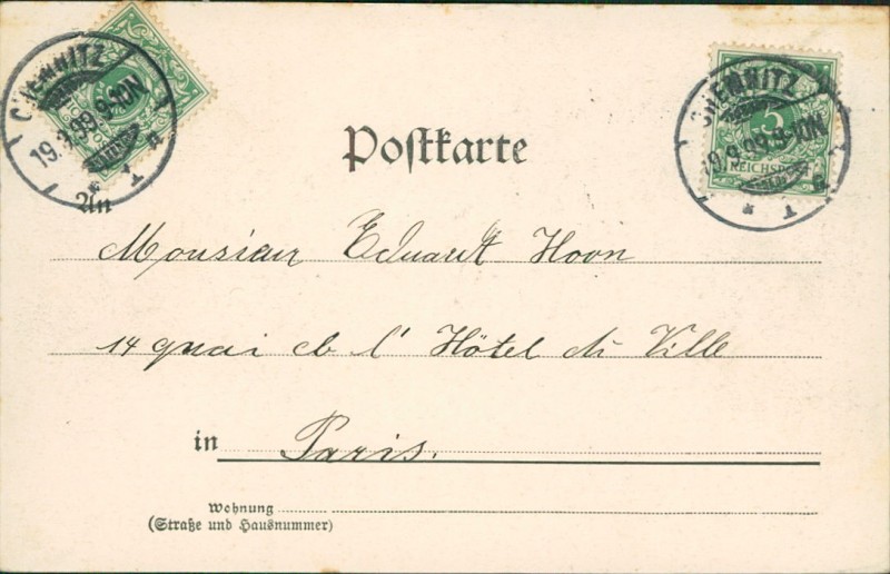 Alte Ansichtskarte aus Chemnitz, gelaufen am 19.09.1899 von Chemnitz nach Paris.