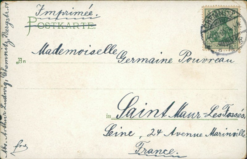 Alte Ansichtskarte aus Chemnitz, gelaufen am 07.11.1905 von Chemnitz nach Saint-Maur-des-Fossés.
