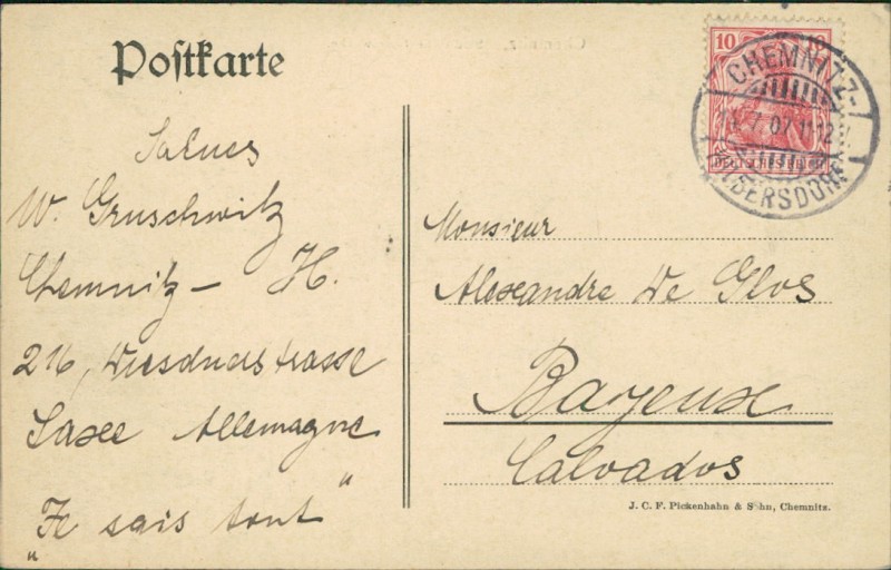 Alte Ansichtskarte aus Chemnitz, gelaufen am 14.07.1907 von Chemnitz-Hilbersdorf nach Bayeux.