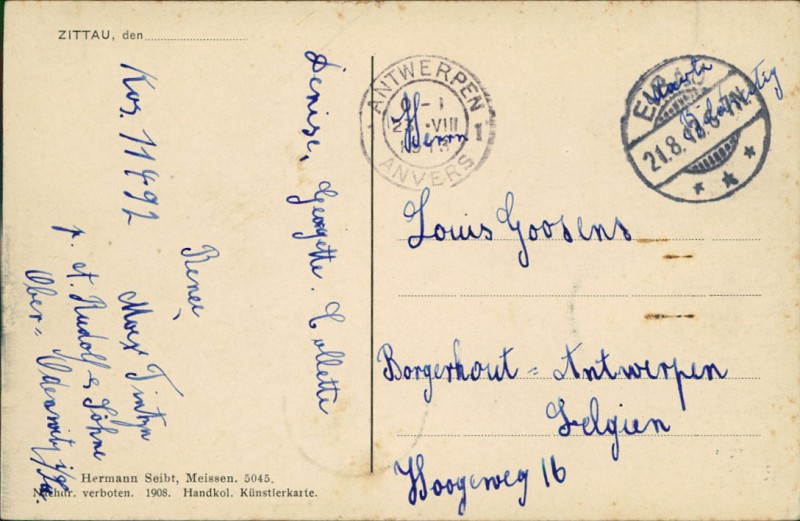 Alte Ansichtskarte aus Zittau, gelaufen am 21.08.1913 von Elbau nach Antwerpen. Ankunft in Antwerpen am 23.08.1913.