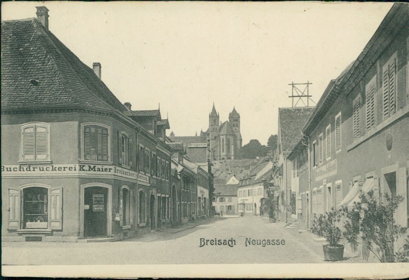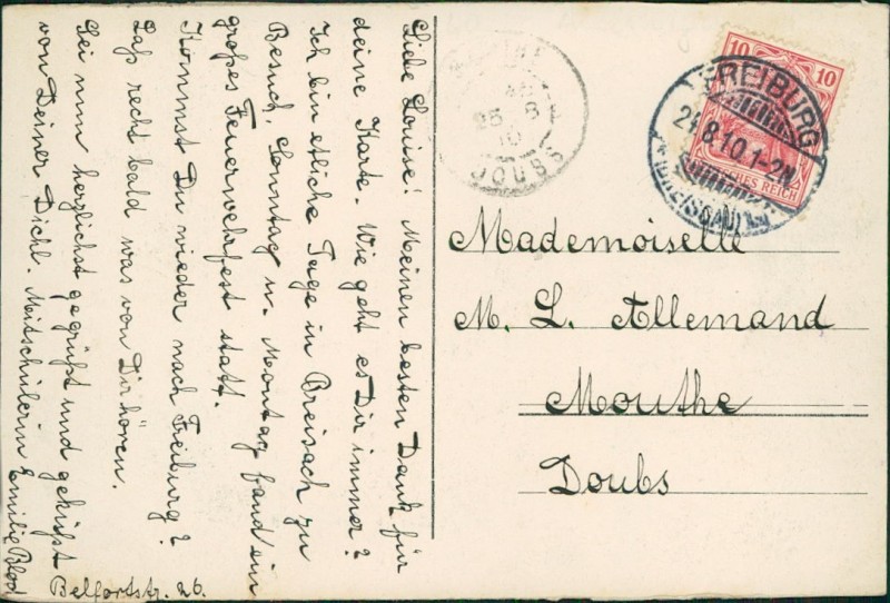 Alte Ansichtskarte aus Breisach am Rhein, gelaufen am 24.08.1910 von Freiburg (Breisgau) nach Doubs.