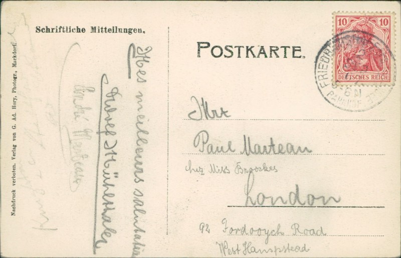 Alte Ansichtskarte aus Markdorf, gelaufen am 02.09.1907 von Friedrichshafen Bahnhof nach London.