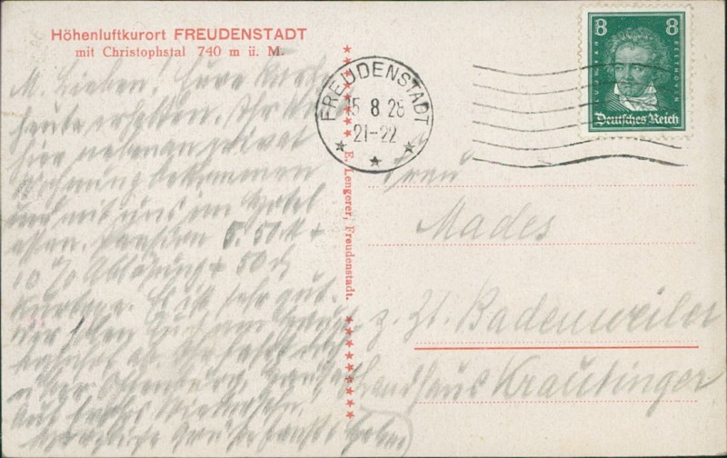 Alte Ansichtskarte aus Freudenstadt, gelaufen am 15.08.1928 von Freudenstadt nach Badenweiler.