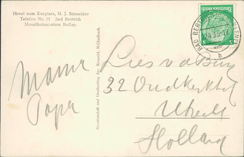 Alte Ansichtskarte aus Bad Bertrich, gelaufen am 22.04.1935 von Bad Bertrich (Bz. Koblenz) nach Utrecht (Holland).