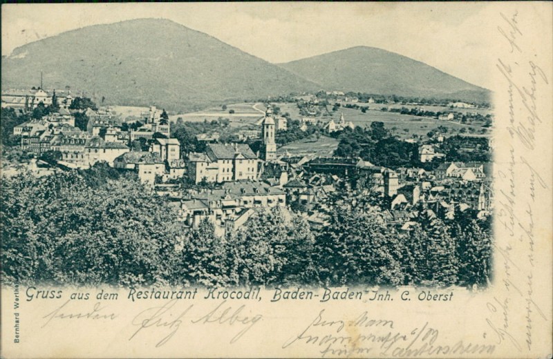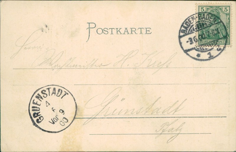 Alte Ansichtskarte aus Baden-Baden, gelaufen am 03.06.1900 von Baden-Baden nach Gruenstadt. Ankunft in Gruenstadt am 04.06.1900.