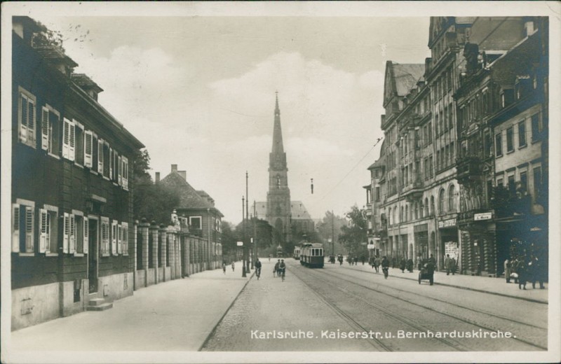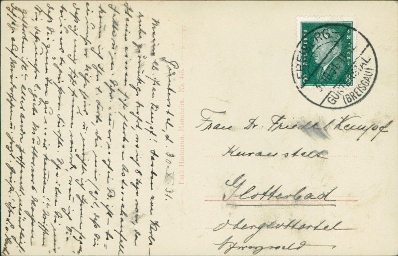 Alte Ansichtskarte aus Karlsruhe, gelaufen am 31.10.1931 von Freiburg-Günterstal nach Glotterbad.