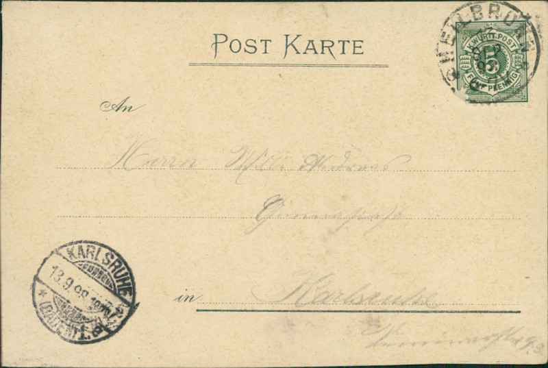 Alte Ansichtskarte aus Heilbronn, gelaufen am 13.09.1898 von Heilbronn nach Karlsruhe. Ankunft in Karlsruhe am 13.09.1898.