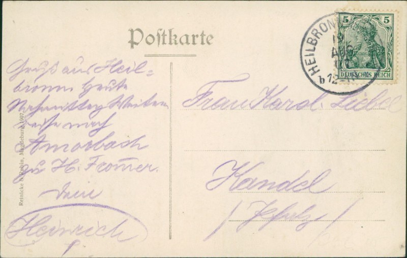 Alte Ansichtskarte aus Heilbronn, gelaufen am 19.08.1907 von Heilbronn nach Kandel.