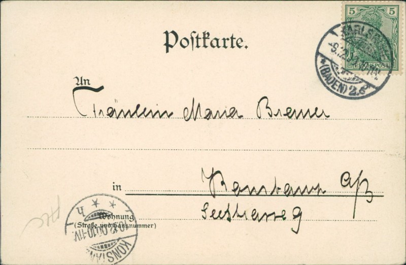 Alte Ansichtskarte aus Karlsruhe, gelaufen am 09.02.1909 von Karlsruhe nach Konstanz. Ankunft in Konstanz am 10.02.1909.