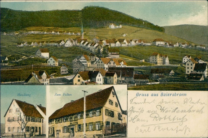 Alte Ansichtskarte aus Baiersbronn, gelaufen am 29.05.1908 von Baiersbronn nach Straßburg. Ankunft in Straßburg am 29.05.1908.