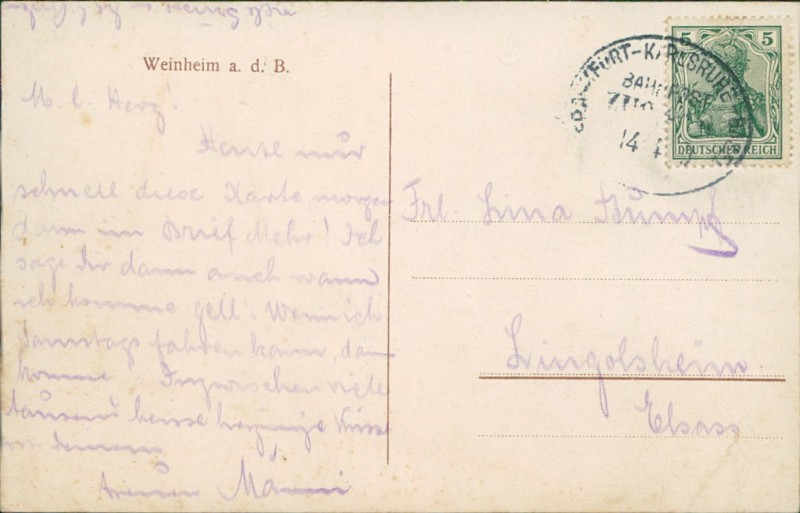 Alte Ansichtskarte aus Weinheim, gelaufen um 1910 von Frankfurt-Karlsruhe-Basel (Bahnpost) nach Lingolsheim Elsass.