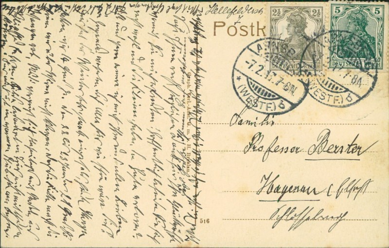Alte Ansichtskarte aus Arnsberg, gelaufen am 07.02.1917 von Arnsberg (Westf.) nach Hagenau.