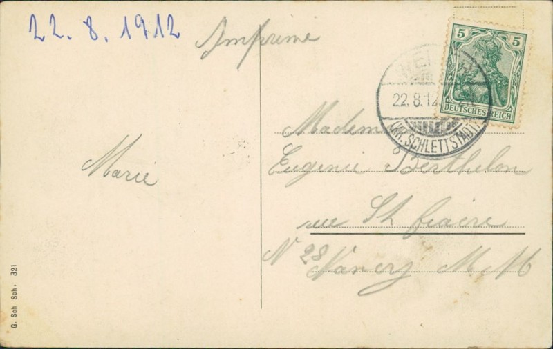 Alte Ansichtskarte aus Schirmeck, gelaufen am 22.08.1912.