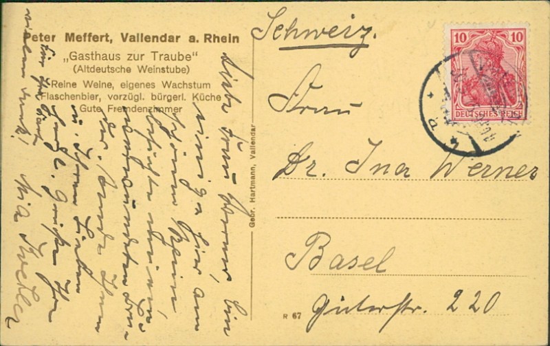 Alte Ansichtskarte aus Vallendar, gelaufen am 30.05.1915 von Vallendar nach Basel.
