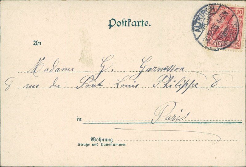 Alte Ansichtskarte aus Altkirch, gelaufen am 30.12.1905 von Altkirch (Oberels.) nach Paris.