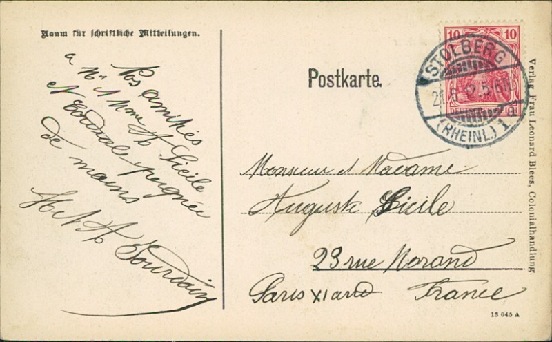 Alte Ansichtskarte aus Stollberg (Rhld.), gelaufen am 21.06.1912 von Stolberg (Rheinl.) nach Paris (Frankreich).