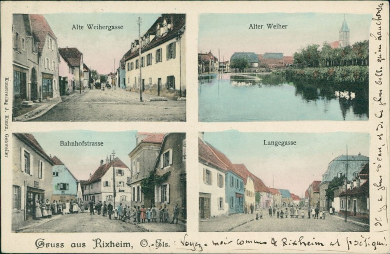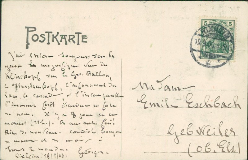Alte Ansichtskarte aus Rixheim, gelaufen am 19.09.1906 von Rixheim nach Gebweiler.