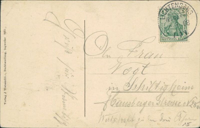 Alte Ansichtskarte aus Lichtenberg, gelaufen am 06.07.1908 von Lichtenberg nach Schiltigheim.